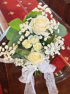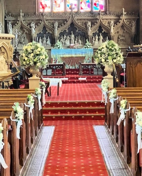 Full length of church with Pedestal and Alter Arrangements and Pew Ends